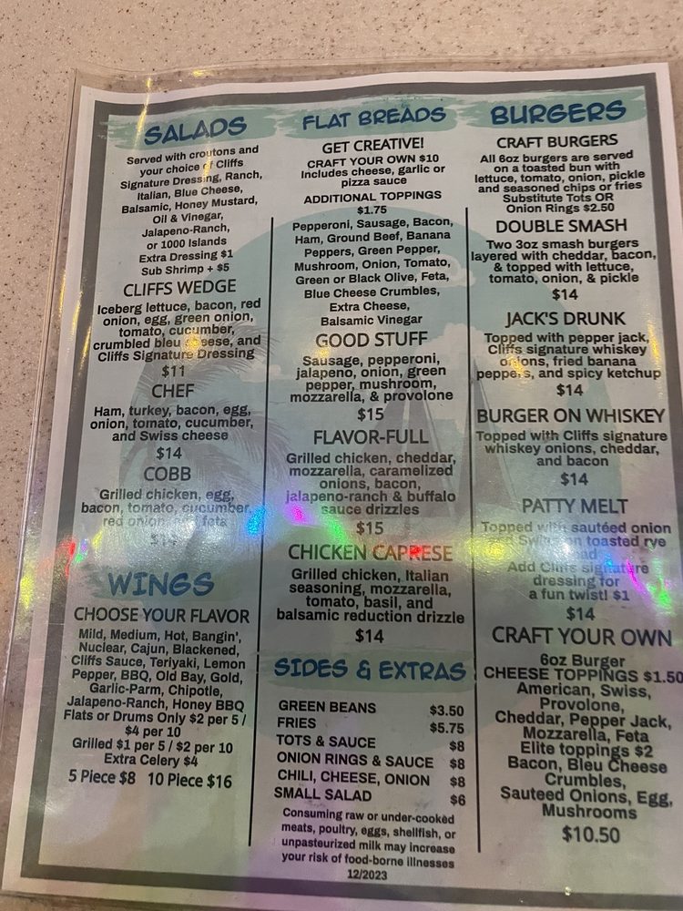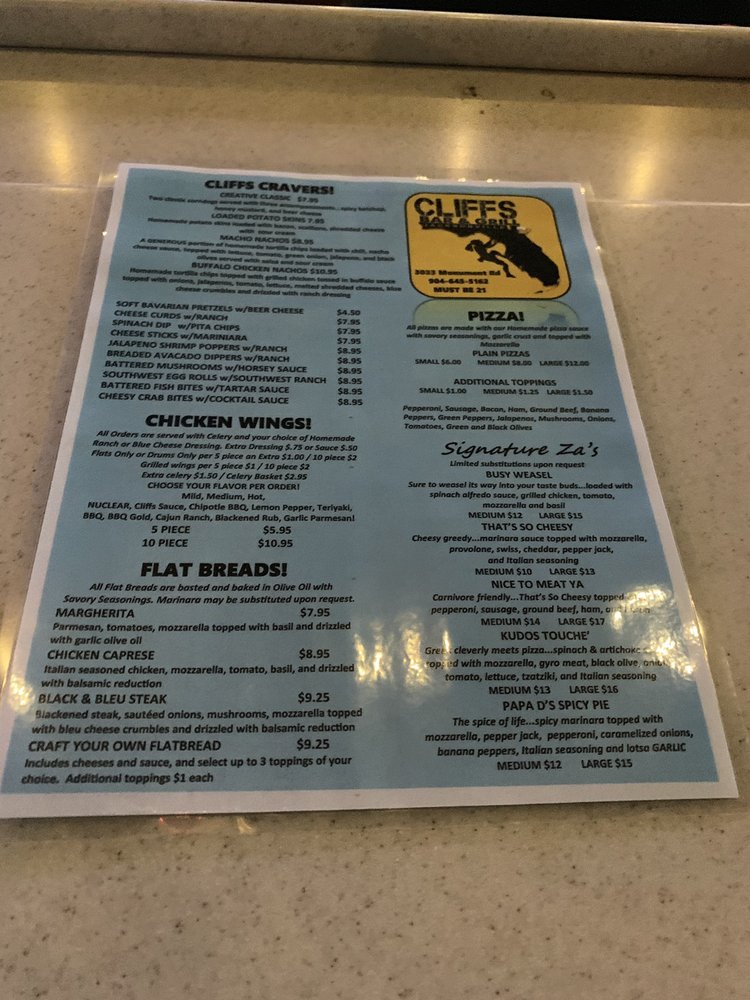 Cliff's Bar & Grill offers a unique American dining experience in Jacksonville, FL. With a variety of options catering to different preferences, including vegetarian choices, this spot is perfect for groups, families, and even solo diners. The menu highlights 2's Company Sharables like Breaded Avocado Dippers and Buffalo Chicken Nachos, as well as flavorful salads and classic Chicken Wings. The bar also features live music on select nights, adding to the vibrant atmosphere. Customers praise the fresh and high-quality food, friendly staff, and enjoyable entertainment. With a diverse menu and a welcoming environment, Cliff's Bar & Grill is a neighborhood gem worth experiencing.
